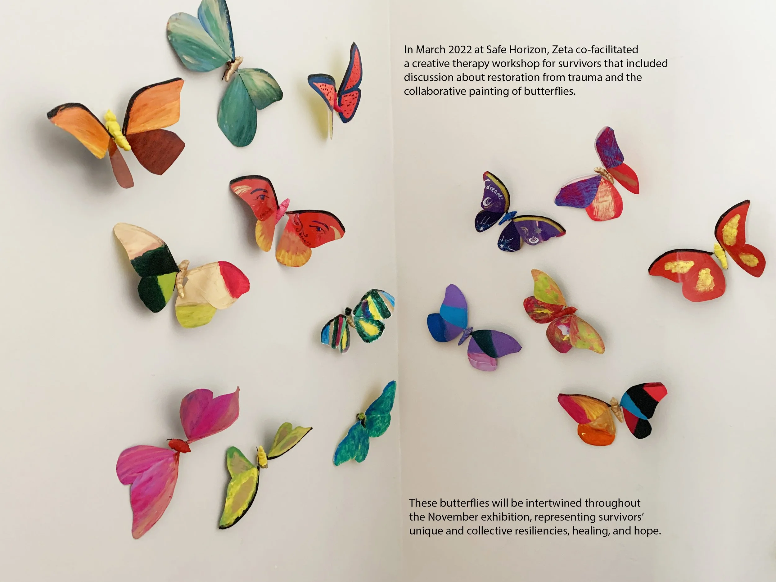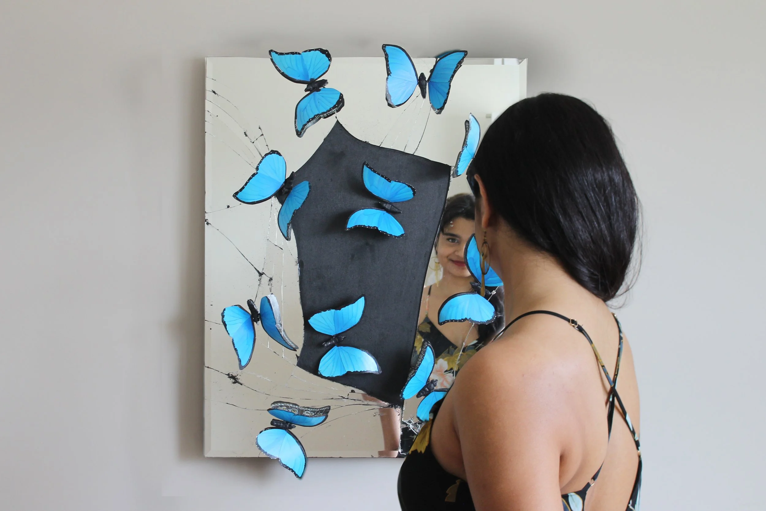 All it takes is a shift in perspective to reveal that the reflection the viewer sees is just that-- a reflection, an image holding no physical weight in itself. Coming through the cracks are butterflies to remind us of our true selves - that we all are beautiful, whole and complete.